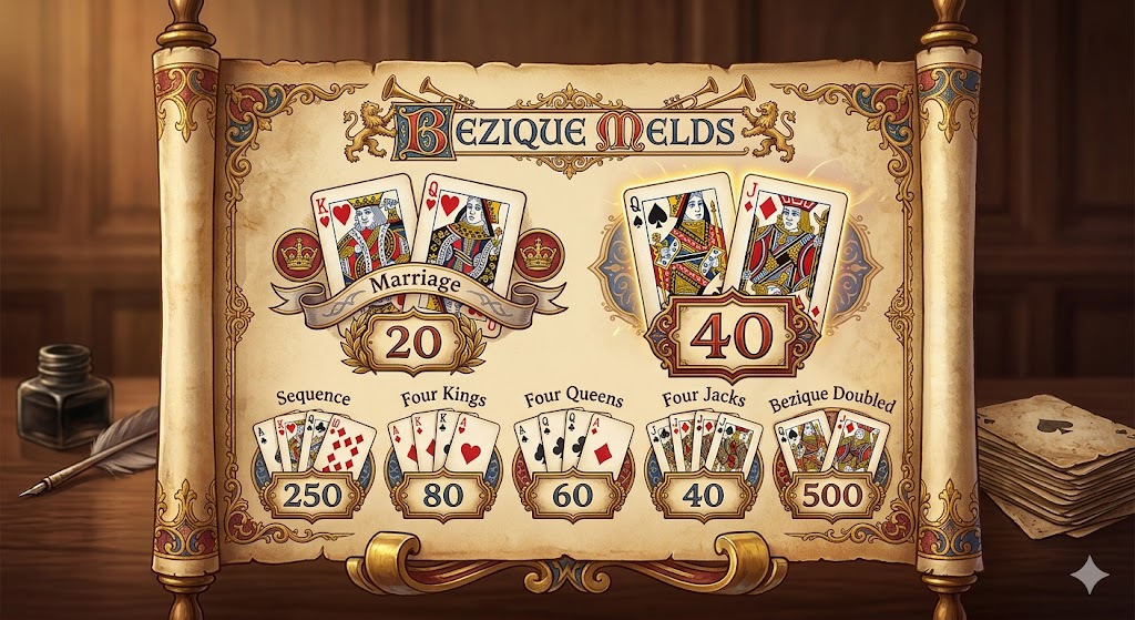 Kernen i Bezique er meldingerne, som er specifikke kombinationer af kort, der giver forskellige pointbeløb. Den mest berømte kombination er selve “Bezique”, som består af Spar Dame og Ruder Knægt. Hvis en spiller kan fremvise begge disse kort efter at have vundet et stik, belønnes det med 40 point. Der findes også mere komplekse kombinationer som “Dobbelt Bezique”, der giver hele 500 point og ofte kan afgøre hele spillet til én spillers fordel.