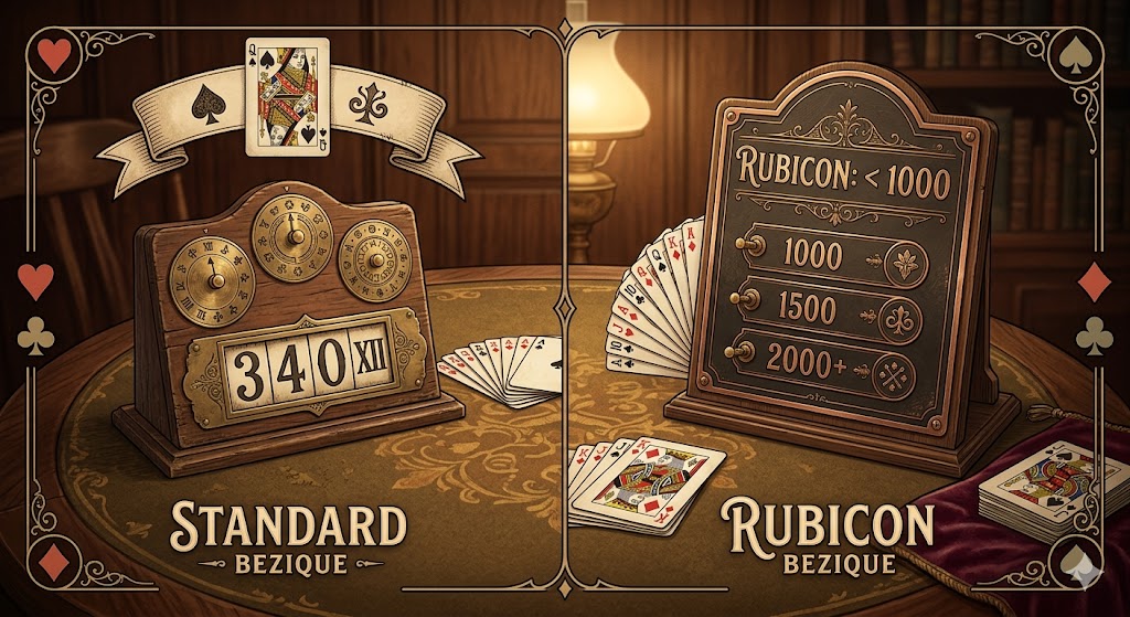 I Rubicon Bezique er pointene for brisques ofte vigtigere, og der gives point for “cartes blanches” (hænder uden billedkort). Dette gør spillet mere dynamisk og reducerer betydningen af rent held, da der er flere måder at score point på selv med en dårlig hånd.